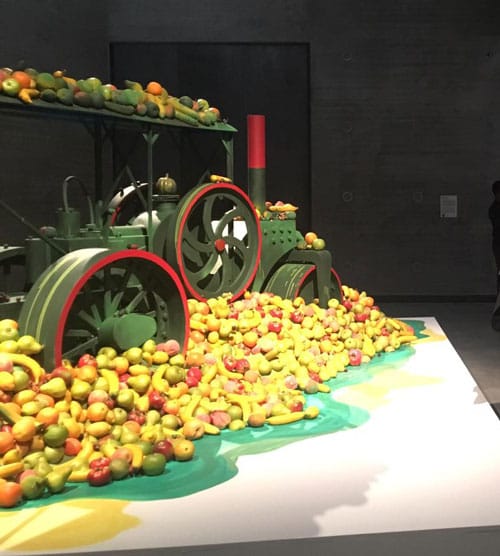 One of the works in All the Sacred Tombs was the head of a train, surrounded by bananas, apples and oranges, all plastic-made.