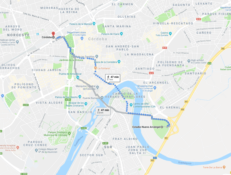 Cordoba according to the city boundary matches about two to three times the size of To Kwa Wan in Hong Kong. To complete a walk from the marked point in the upper left (of the map below) to that in the lower right, it took only 40 minutes.
